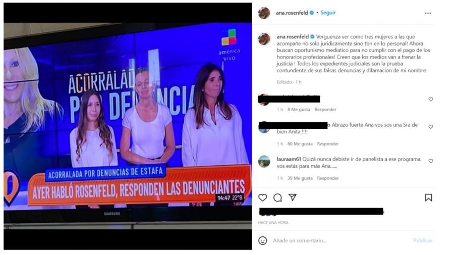 "Vergüenza ver como tres mujeres a las que acompañé, no solo jurídicamente, sino también en lo personal. Ahora buscan oportunismo mediático para no cumplir con el pago de los honorarios profesionales. ¡Creen que los medios van a frenar la Justicia! Todos los expedientes judiciales son la prueba contundente de sus falsas denuncias y difamación de mi nombre", escribió Rosenfeld en un posteo en su cuenta de Instagram.