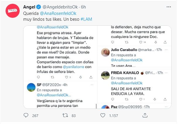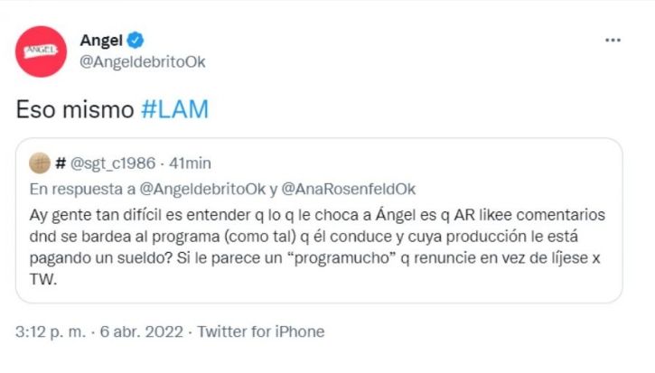 Luego, un usuario comentó al respecto: "Ay, gente. ¿Tan difícil es entender que lo que le choca a Ángel es que Ana Rosenfeld likee comentarios donde se bardea al programa (como tal) que él conduce y cuya producción le está pagando un sueldo? Si le parece un 'programucho', que renuncie en vez de quejarse por Twitter". A lo que Ángel contestó: "Eso mismo".