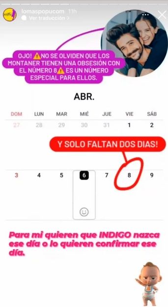 La llamativa especulación la lanzó el usuario de Instagram @lomaspopucom cuando explicó: "Ojo, no se olviden que los Montaner tienen una obsesión con el número 8. Es un número especial para ellos". Y agregó: "Para mí que quieren que Índigo nazca ese día, o lo quieren confirmar ese día".