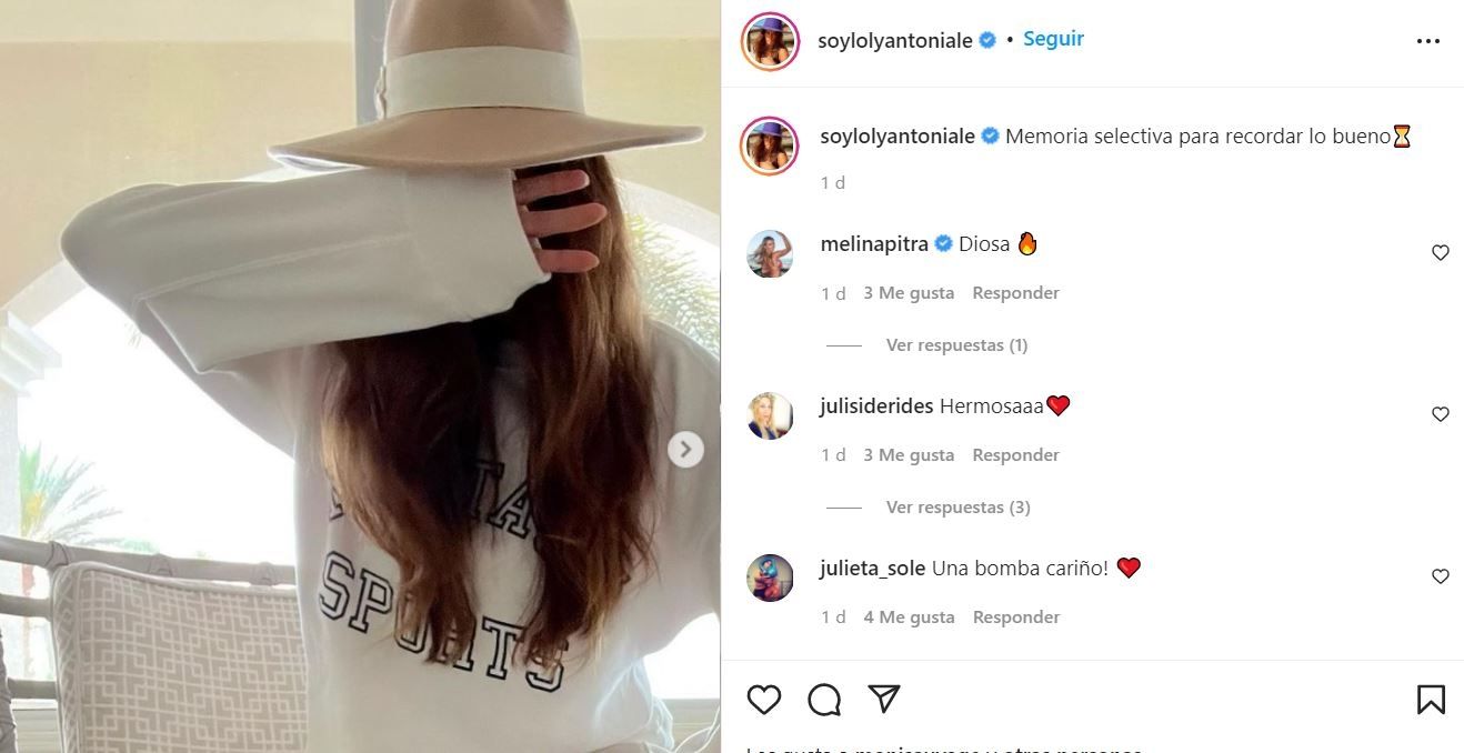“Memoria selectiva para recordar lo bueno”, escribió la cordobesa en su cuenta de Instagram, junto a una foto donde aparece con el rostro cubierto, la primera de una seguidilla de selfies vestida de blanco en lo que parece ser la mansión en la que vive con su marido.
