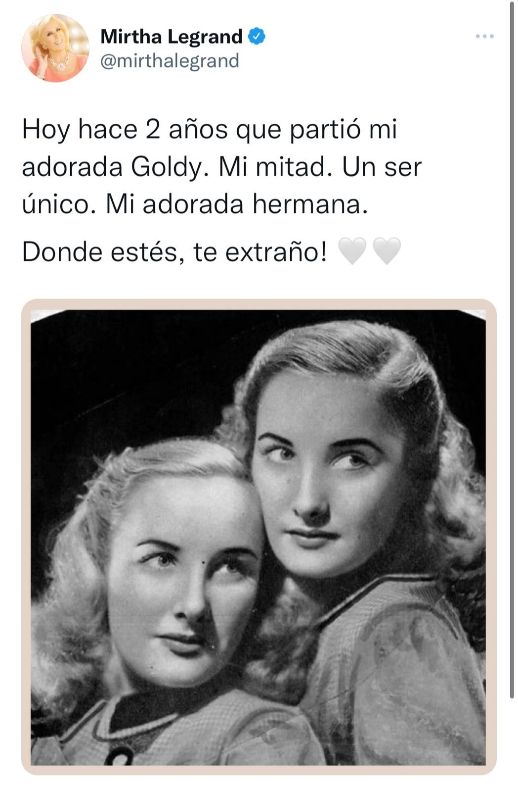 Hoy, primero de mayo de 2022 Mirtha Legrand recordó a su adorada hermana con un mensaje especial mediante su cuenta de Twitter. La famosa diva posteó una postal de su juventud donde se la ve a ella junto a su hermana Silvia y escribió emocionando a todos: "Hoy hace 2 años que partió mi adorada Goldy. Mi mitad. Un ser único. Mi adorada hermana. Donde estés, te extraño".