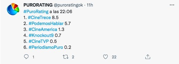 Esta performance no le alcanzó para superar a su principal competidor, El Trece, que volvió a apostar al cine con El Implacable, alcanzando picos de 9 puntos a las 22:12.