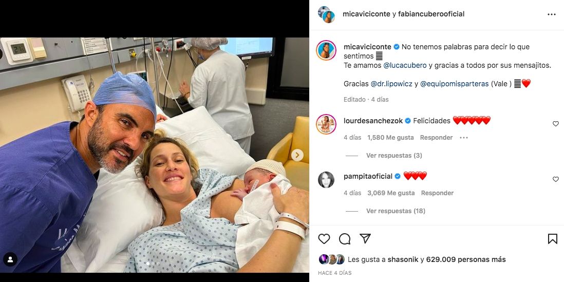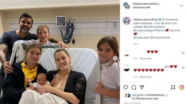 Para devolver el gesto, Cubero y Viciconte compartieron en sus respectivas cuentas el posteo. "Un momento súper esperado, morí de amor con ustedes", escribieron desde sus redes. En la primera foto, se podía ver a Fabián, Mica, Luca, Indiana, Allegra y Sienna, todos juntos en la clínica. Y, en las siguientes, a cada una de las hijas de Poroto cargando en brazos a su hermanito.