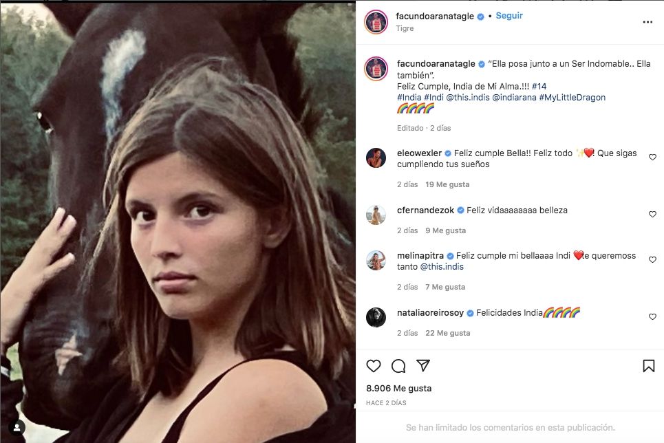 Arana le agregó un texto muy emotivo al escribir: “Ella posa junto a un ser indomable…Ella también. Feliz cumple, India de mi alma”. Rápidamente se amontonaron las felicitaciones de celebridades que sienten una amistad por Facundo, así se acumularon los comentarios de personajes como Eleonora Wexler, Natalia Oreiro, Melina Pitra o Mercedes Funes.