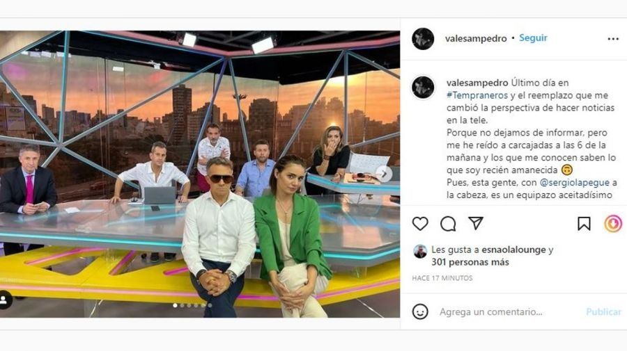 A través de un posteo en su cuenta de Instagram, Valeria Sampedro había expresado: "Último día en Tempraneros y el reemplazo que me cambió la perspectiva de hacer noticias en la tele. Porque no dejamos de informar, pero me he reído a carcajadas a las 6 de la mañana y los que me conocen saben lo que soy recién amanecida. Pues, esta gente, con @sergiolapegue a la cabeza, es un equipazo aceitadísimo que te hace el laburo facil y feliz. Los de delante de cámara, los que están detrás y quienes lo ponen al aire. Amé Tempraneros. Gracias por dejarme ser parte".