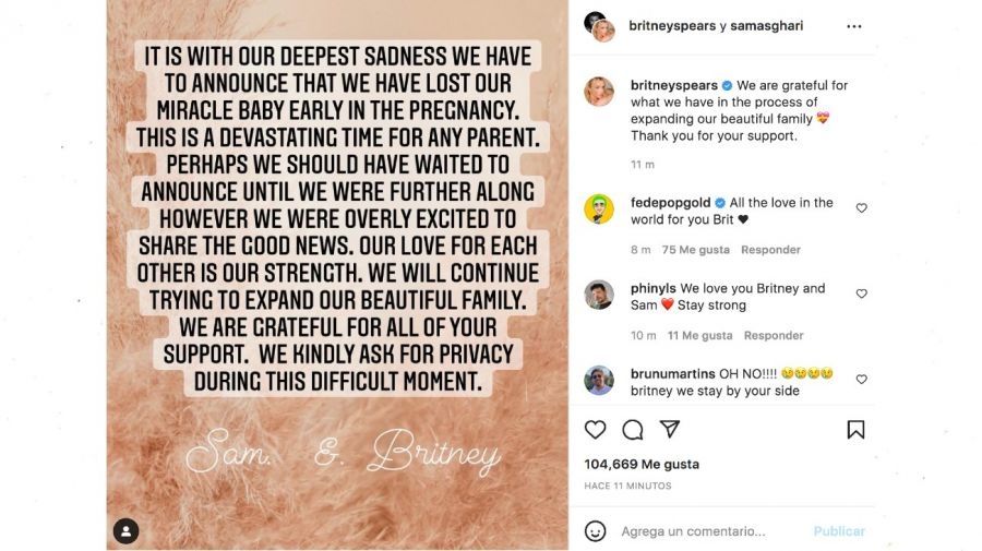 Tras haber anunciado el pasado 11 de abril su embarazo, Britney hizo un triste anuncio a través de su cuenta de Instagram. “Es con nuestra más profunda tristeza que tenemos que anunciar que hemos perdido a nuestro bebé milagroso al principio del embarazo. Este es un momento devastador para cualquier padre. Quizá deberíamos haber esperado un poco más para hacer el anuncio [del embarazo] pero estábamos tan emocionados de compartir la buena noticia. Nuestro amor mutuo es nuestra fuerza. Seguiremos intentando ampliar nuestra hermosa familia. Estamos agradecidos por todo su apoyo. Pedimos amablemente privacidad durante este momento difícil”, expresó la cantante a través de un comunicado.
