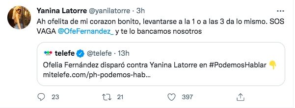 "Ah ofelita de mi corazon bonito, levantarse a la 1 o a las 3 da lo mismo. SOS VAGA @OfeFernandez_ y te lo bancamos nosotros", agregó.
