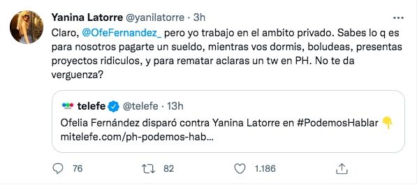 "Claro, @OfeFernandez_ pero yo trabajo en el ambito privado. Sabes lo q es para nosotros pagarte un sueldo, mientras vos dormis, boludeas, presentas proyectos ridiculos, y para rematar aclaras un tw en PH. No te da verguenza?", disparó.