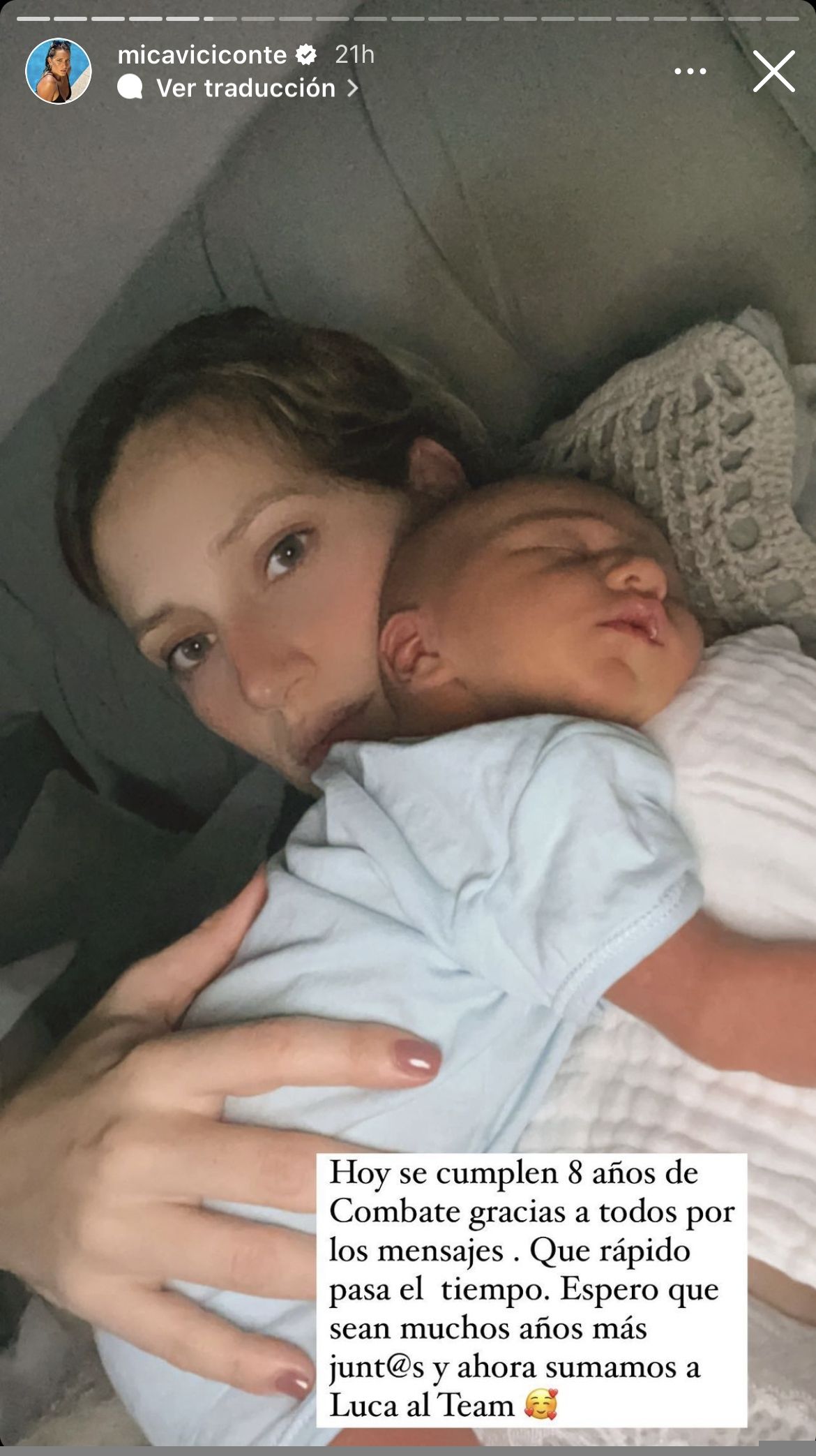 Como consecuencia de esto, Mica decidió compartir una tierna postal junto a Luca a “upa” en la que escribió: "hoy se cumplen ocho años de Combate, gracias a todos por los mensajes. Qué rápido pasa el tiempo, espero que sean muchos años más juntos... Y ahora sumamos a Luca al equipo”.