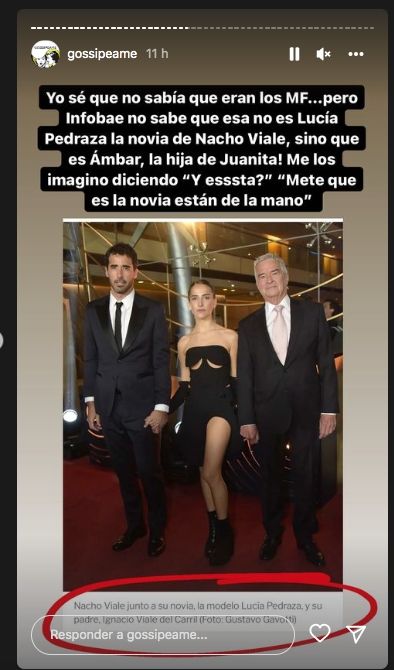 No obstante, se produjo un error increíble, una equivocación tremenda e imperdonable. Resulta que en la cobertura de la alfombra roja, el sitio Infobae publicó en una imagen en la que aparecen Nacho, Ámbar e Ignacio Viale del Carril una información errónea.