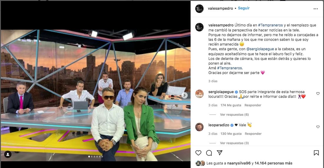 A la hora de valorar la sinergia con el grupo de trabajo, Valeria redactó: “Pues, esta gente, con Sergio a la cabeza, es un equipazo aceitadísimo que te hace el laburo fácil y feliz. Los de delante de cámara, los que están detrás y quienes lo ponen al aire. Amé Tempraneros. Gracias por dejarme ser parte".