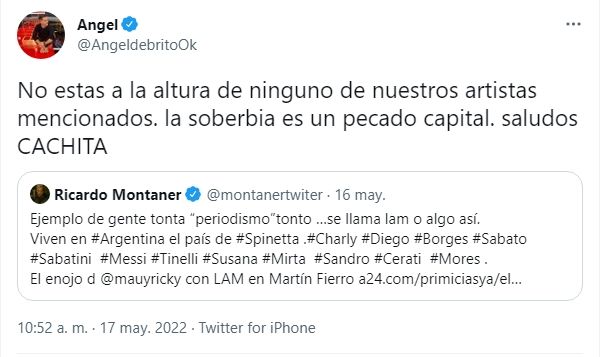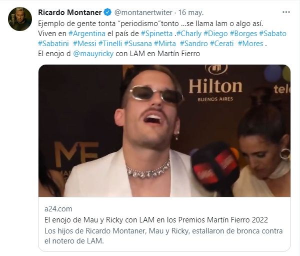 "Ejemplo de gente tonta, periodismo tonto... Se llama LAM o algo así. Viven en Argentina, el país de Spinetta, Charly, Diego, Borges, Sabato, Sabatini, Messi, Tinelli, Susana, Mirta, Sandro, Cerati, Mores", compartió furioso Montaner.