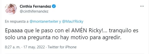 La que también se sumó a la polémica fue Cinthia Fernández. "Epaaaa qué le pasó con el AMÉN, Ricky. Tranquilo, es sólo una pregunta, no hay motivo para agredir", le respondió a Ricardo.