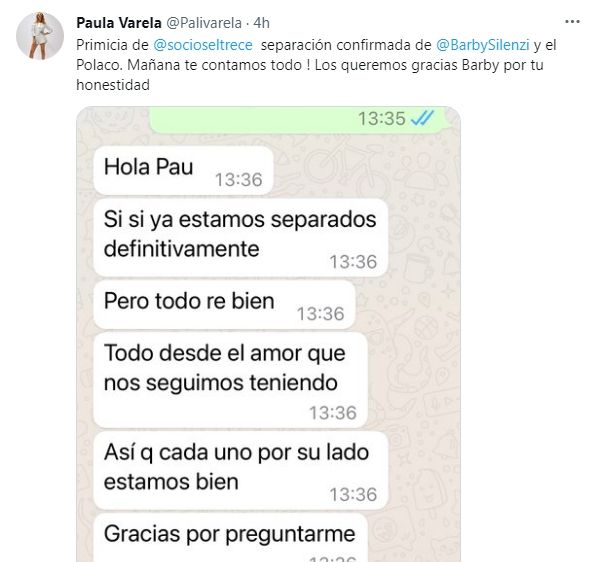 Luego de tantos idas y vueltas, El Polaco y Barby Silenzi decidieron dar por finalizada su relación. Así lo confirmó Paula Varela vía Twitter: "Primicia de Socios del espectáculo, separación confirmada de Barby y el Polaco ¡Mañana te contamos todo! Los queremos, gracias Barby por tu honestidad", escribió la panelista de Socios del Espectáculo, adjuntando una captura de pantalla de un chat entre ellas.