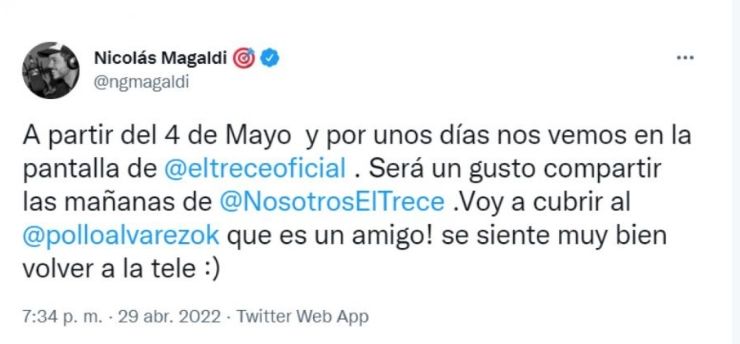 El conductor sorprendió a sus seguidores al anunciar la feliz noticia. "A partir del 4 de mayo, y por unos días, nos vemos en la pantalla de @eltreceoficial. Será un gusto compartir las mañanas de @NosotrosElTrece. Voy a cubrir al @polloalvarezok que es un amigo. Se siente muy bien volver a la tele", expresó en su cuenta de Twitter.