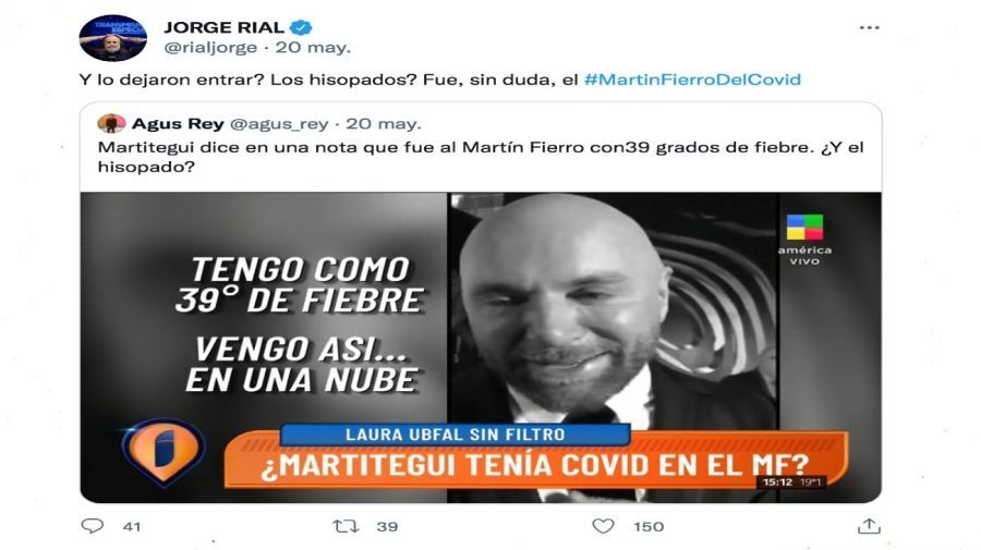 El periodista Agus Rey había escrito en su cuenta de Twitter: " Martitegui dice en una nota que fue al Martín Fierro con 39 grados de fiebre. ¿Y el hisopado?", y Jorge Rial compartió ese posteo cuestionando duramente a los organizadores del evento. "¿Y lo dejaron entrar? ¿Los hisopados? Fue, sin duda, el Martín Fierro del Covid", arremetió el conductor.