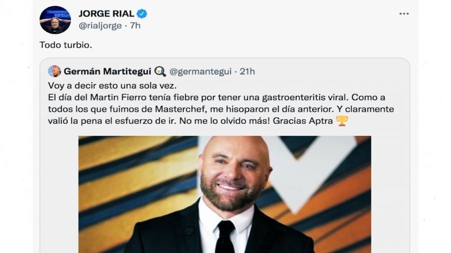 Tras quedar en la mira, Germán Martitegui había publicado un descargo en el que expresó: "Voy a decir esto una sola vez. El día del Martín Fierro tenía fiebre por tener una gastroenteritis viral. Como a todos los que fuimos de 'Masterchef', me hisoparon el día anterior. Y claramente valió la pena el esfuerzo de ir. ¡No me lo olvido más! Gracias APTRA".
