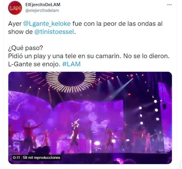 Sin embargo, una polémica se desató cuando el cantante de "Cumbia 420" se mostró un poco perdido y con pocas ganas de dar el show. Como si fuera poco, en un momento decidió marcharse sin despedirse y dejando sola a Tini en medio del escenario. Según LAM, estaba furioso: "Pidió una play y una tele en su camarín. No se lo dieron. L-Gante se enojó".