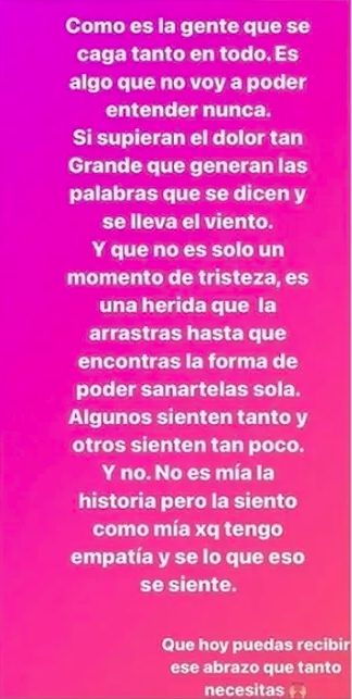 "Cómo es la gente que se cag... tanto en todo. Es algo que no voy a poder entender nunca. Si supieran el dolor tan grande que generan las palabras que se dicen y se lleva el viento...", comenzó expresando la cantante.