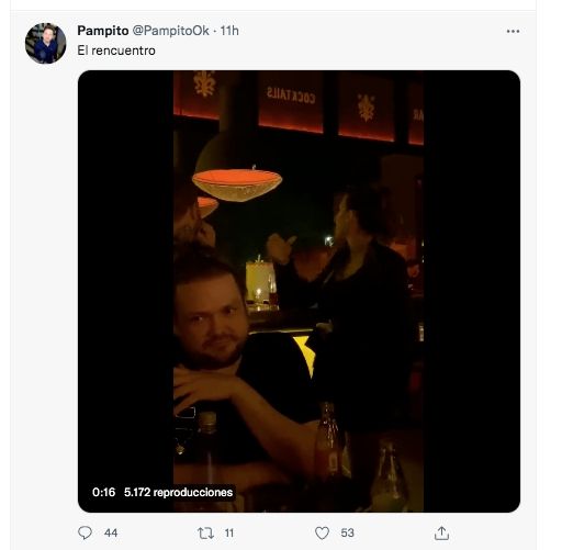 Todo surgió de la cuenta del periodista Pampito, que aprovechó una filmación de un internauta y la posteó en su cuenta de Twitter, con el título de “el reencuentro”. Así se los ve muy compinches en la barra de un boliche con mucha onda, ambos sonrientes y toqueteándose.
