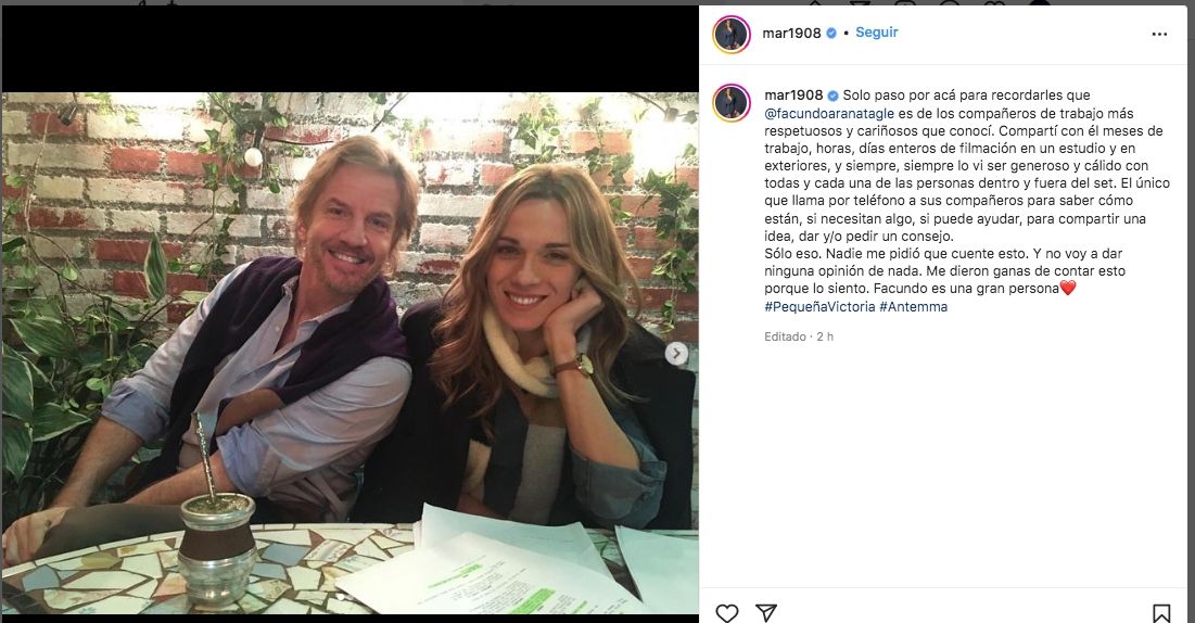 Con una serie de fotos juntos en el set de grabación de Pequeña Victoria, Mariana aseguró: “Compartí con él meses de trabajo, horas, días enteros de filmación en un estudio y en exteriores y siempre, siempre fue generoso y cálido con todas y cada una de las personas dentro y fuera del set".