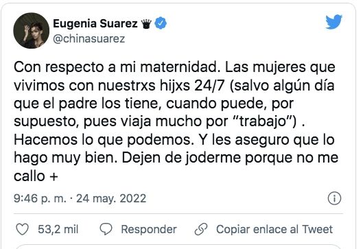 Inmediatamente, Suárez reaccionó, algo que no suele estar entre sus recursos, y saltó a Twitter para escribir su defensa y argumentar cómo cría a sus hijos. "Con respecto a mi maternidad las mujeres que vivimos con nuestros hijos 24/7..."Salvo algún dia que el padre los tiene, cuando puede, por supuesto, pues viaja mucho por 'trabajo'"., posteó.