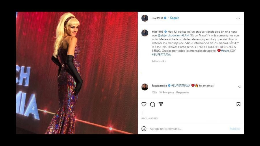 Poco más tarde, a través de sus redes sociales, la actriz compartió un posteo en el que expresó: “Hoy fui objeto de un ataque transfóbico en una nota con LAM. ‘¡Es un Trava!’, y más comentarios con odio”, comenzó el descargo. “Me encantaría no darle relevancia pero hay que visibilizar y detener los mensajes de odio e intolerancia en los medios. Sí, soy toda una trava y amo serlo. Tengo todo el derecho de serlo. Gracias a todos por los mensajes de apoyo”.