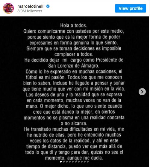 "Siempre que se toman decisiones es imposible complacer a todos. He decidido dejar mi cargo como presidente de San Lorenzo de Almagro", afirmó Tinelli en el inicio de un largo comunicado que publicó en su cuenta de Instagram.