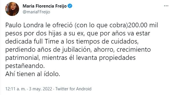 Desde su cuenta de Twitter, Florencia Freijo fue quien dio a conocer la cifra. "Paulo Londra le ofreció (con lo que cobra)200.00 mil pesos por dos hijas a su ex, que por años va estar dedicada full Time a los tiempos de cuidados, perdiendo años de jubilación, ahorro, crecimiento patrimonial, mientras él levanta propiedades pestañeando. Ahí tienen al ídolo", expresó la escritora en sus redes sociales.