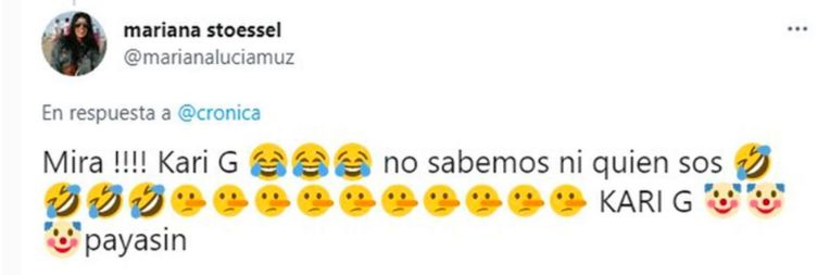 Además, reveló que también fue contactado por familiares de la cantante. Alertada por sus dichos, Mariana Muzlera, madre de Tini, decidió romper el silencio a través de su cuenta de Twitter. "Mirá Kari G, no sabemos quién sos. Kari G payasín", escribió junto a emojis de risas y payasos.