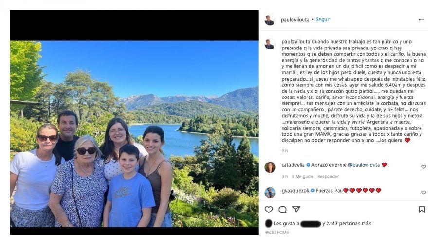 "Cuando nuestro trabajo es tan público y uno pretende que la vida privada sea privada, yo creo que hay momentos que se deben compartir con todos por el cariño, la buena energía y la generosidad de tantos y tantas que me conocen o no y me llenan de amor en un día difícil como es despedir a mi mamá. Es ley de los hijos pero duele, cuesta y nunca uno está preparado", comenzó Paulo Vilouta en el posteo acompañado por una postal familiar.
