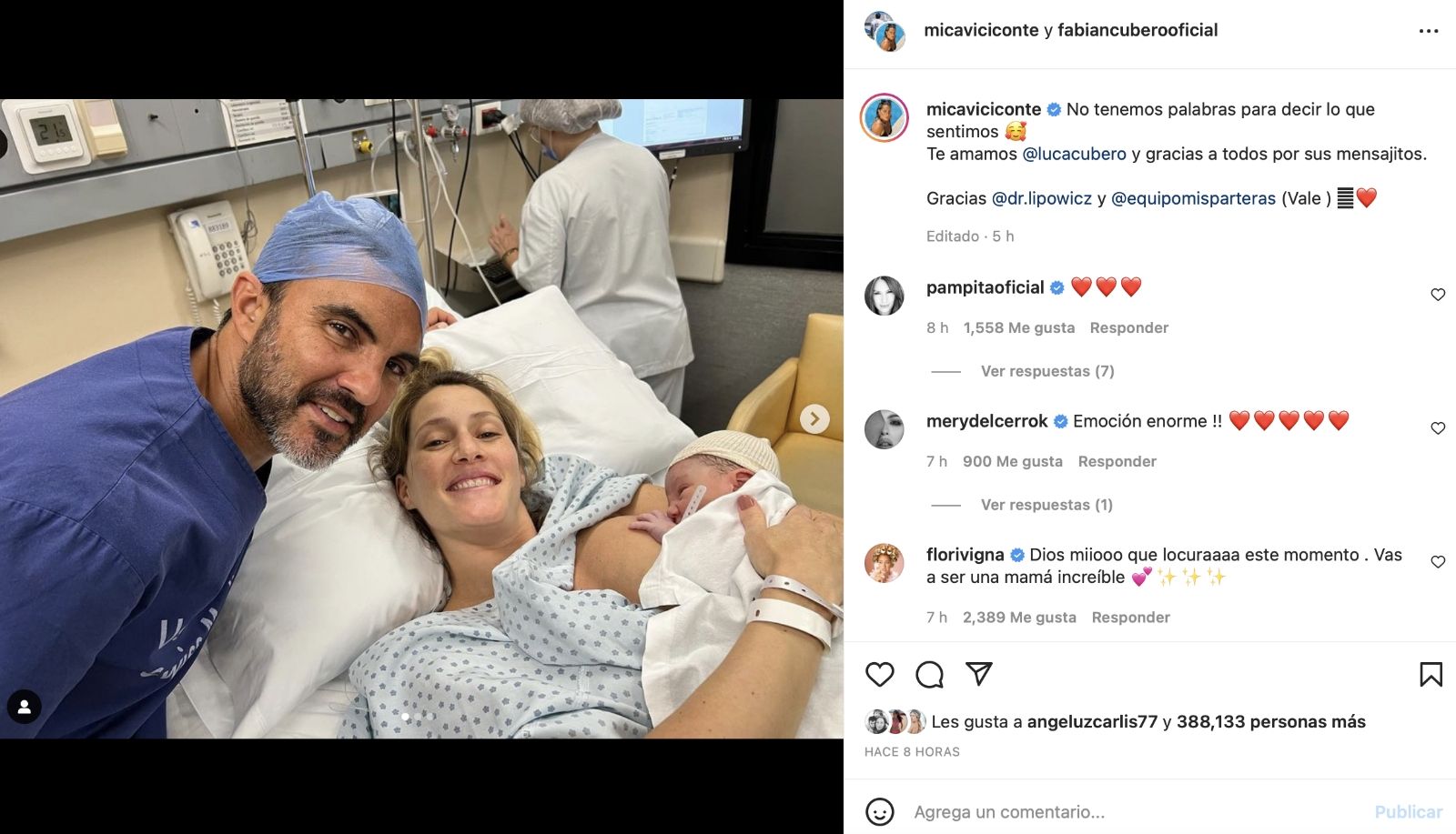 "No tenemos palabras para decir lo que sentimos. Te amamos Luca Cubero. Gracias a todos por sus mensajitos”, escribió Mica Viciconte. La publicación ya superó los más de 380 mil “me gusta” y tiene casi 8 mil comentarios, entre los que se destacan mensajes de Pampita, Mery del Cerro y Flor Vigna entre otras tantas figuras del espectáculo.
