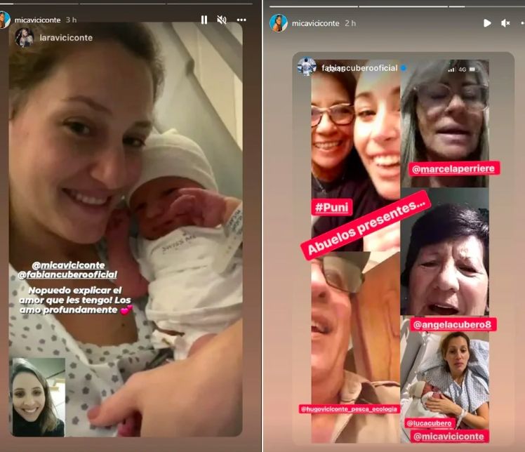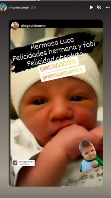 La flamante mamá reposteó un mensaje de su hermano, Diego Viciconte, que compartió en sus historias la imagen de su sobrino "Hermoso Luca. Felicidades hermana y Fabi. Felicidad absoluta", expresó.