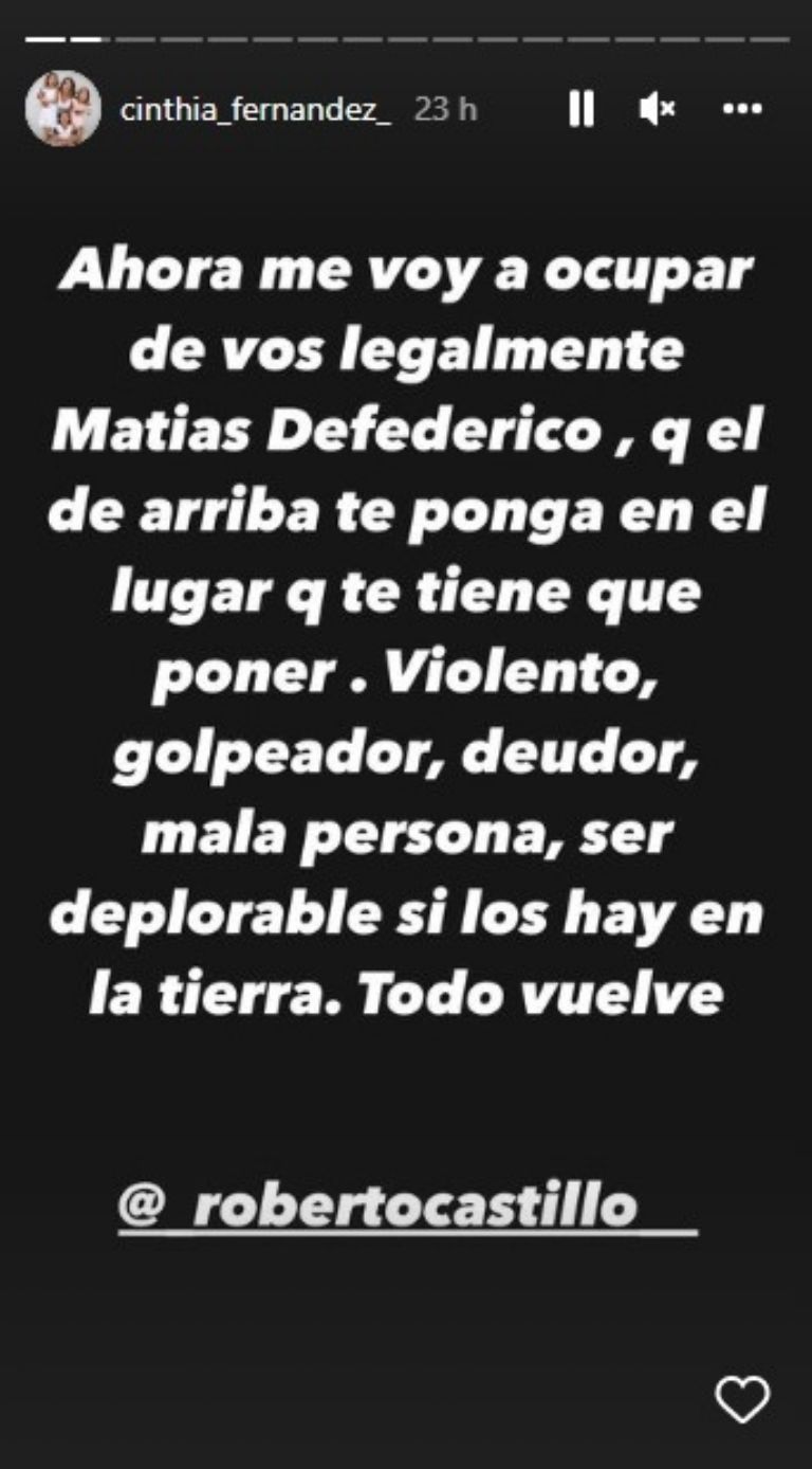 Después de señalar en Nosotros a la mañana que las declaraciones de su ex eran de “un machirulismo” que no la sorprendía, ya que la casa “es de los dos”, Cinthia volvió a usar su cuenta de Instagram para expresarse contra Defederico y dejarle una fuerte advertencia.