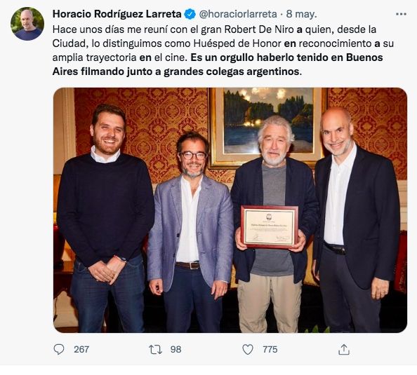"Es un orgullo haberlo tenido en Buenos Aires filmando junto a grandes colegas argentinos", comentó al respecto el jefe de Gobierno porteño, Horacio Rodríguez Larreta, en un mensaje que publicó en su cuenta personal de Twitter.