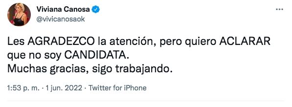 Tras las repercusiones de sus dichos, Viviana enfrentó los rumores que ella misma inició. "Les AGRADEZCO la atención, pero quiero ACLARAR que no soy CANDIDATA. Muchas gracias, sigo trabajando", publicó en su cuenta de Twitter, despejando dudas de quienes tomaron muy en serio sus declaraciones.
