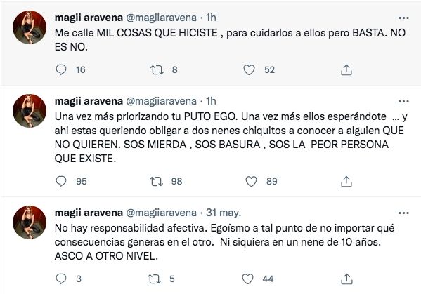 "Una vez más priorizando tu PUTO EGO. Una vez más ellos esperándote … y ahí estás queriendo obligar a dos nenes chiquitos a conocer a alguien QUE NO QUIEREN. SOS MIERDA , SOS BASURA , SOS LA PEOR PERSONA QUE EXISTE", agregó sobre la actitud que tuvo Salvio con sus hijos.