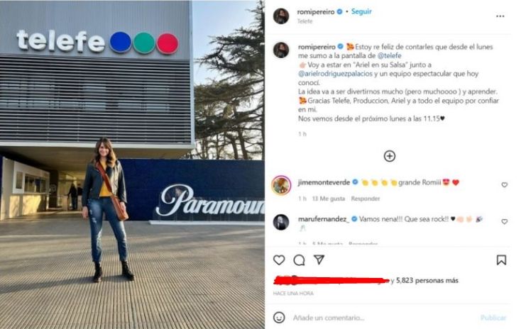 "Estoy re feliz de contarles que desde el lunes me sumo a la pantalla de @telefe. Voy a estar en Ariel en su Salsa junto a @arielrodriguezpalacios y un equipo espectacular que hoy conocí", confirmó la nutricionista. "La idea va a ser divertirnos mucho (pero muchoooo) y aprender. Gracias Telefe, producción, Ariel y a todo el equipo por confiar en mí. Nos vemos desde el próximo lunes a las 11.15", finalizó feliz Pereiro.
