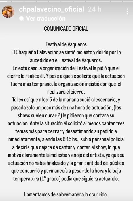 Tras las fuertes repercusiones por lo sucedido, el equipo de trabajo del cantante decidió emitir un comunicado oficial que difundió a través de su cuenta de Instagram. "El Chaqueño Palavecino se sintió molesto y dolido por lo sucedido en el Festival de Vaqueros. En este caso, la organización del Festival le pidió que el cierre lo realice él. Y pese a que se solicitó que la actuación fuera más temprano, la organización insistió con que él realizara el cierre", comienza diciendo el texto.