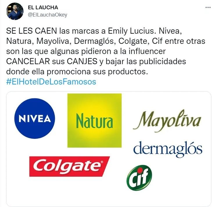 Debido a las fuertes criticas que recibe la hermana de Belu Lucius, varias marcas decidieron dejar de trabajar con ella: "Se les caen las marcas a Emily Lucius. Son algunas que pidieron a la influencer cancelar sus canjes y bajar las publicidades donde ella promociona sus productos". Nivea, Natura, Colgate, Mayoliva, Cif y Dermaglós fueron algunas.