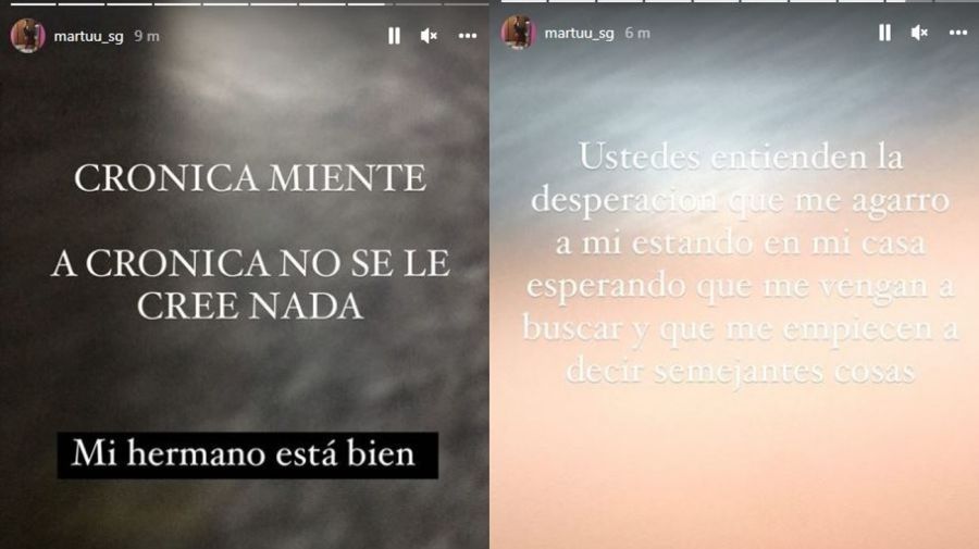 "Crónica miente. A Crónica no se le cree nada. Mi hermano está bien", escribió la hermana de El Noba desde sus historias de Instagram. Luego agregó: "Ustedes entienden la desesperación que me agarró estando en mi casa esperando que me vengan a buscar y que me empiecen a decir semejantes cosas".
