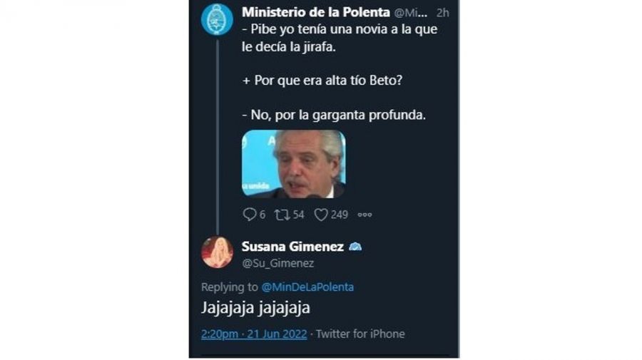 Mientras se replicaron los memes e ironías por el furcio, Susana Giménez comentó un posteo de la cuenta Ministerio de la Polenta, desde donde satirizaron con la siguiente secuencia: "Pibe, yo tenía una novia a la que le decía jirafa". "¿Porque era alta, tío Beto?". "No, por la garganta profunda".