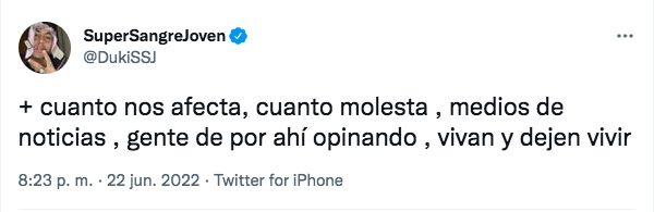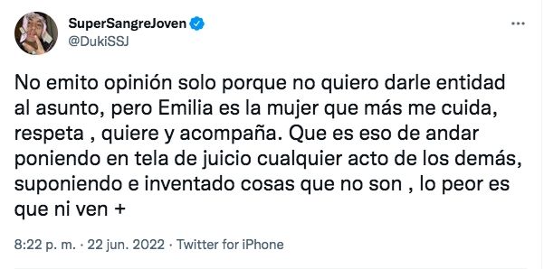 Tras las repercusiones que se desataron en las redes sociales, Duki salió a aclarar la situación: "O tal vez Emilia salió con su equipo de Sony, del cual Paco (el chico que vemos ahí) es parte. Por el amor de Dios dejen de meterse en nuestra relación, con Emilia vivo todo los días, 24 horas al día, y ustedes ni se enteran. Les pido que no opinen más, realmente nos afecta", expresó sin vueltas el trapero en su cuenta de Twitter.