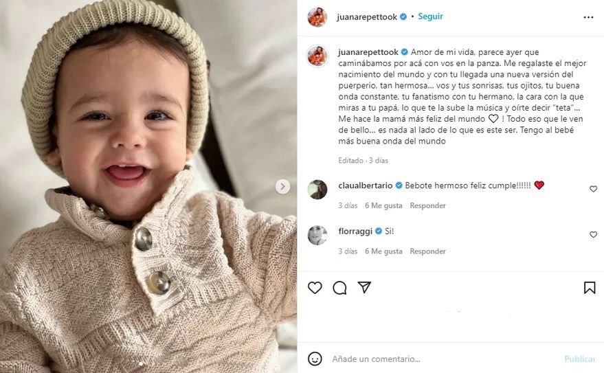 En uno de los posteos en su cuenta de Instagram dedicado al dulce niño, Juana Repetto expresó: “Amor de mi vida, parece ayer que caminábamos por acá con vos en la panza. Me regalaste el mejor nacimiento del mundo y con tu llegada una nueva versión del puerperio, tan hermosa. Vos y tus sonrisas, tus ojitos, tu buena onda constante, tu fanatismo con tu hermano, la cara con la que miras a tu papá, lo que te la sube la música y oírte decir ´teta’. Me hace la mamá más feliz del mundo. Todo eso que le ven de bello es nada al lado de lo que es este ser. Tengo al bebé más buena onda del mundo”.