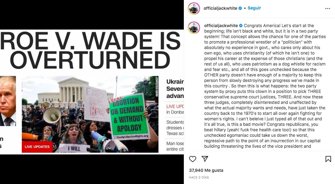 El reconocido músico Jack White fue otro de los músicos que se sumó a la oleada cuando en su perfil de Instagram felicitó irónicamente a su país y criticó la raíz conservadora del fallo de la Corte Suprema, conformada en la actualidad por nueve magistrados, entre ellos tres designados por el expresidente Donald Trump.