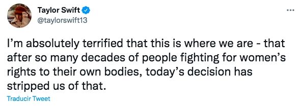 "Estoy absolutamente horrorizada de que este sea el lugar en el que estamos, de que después de tantas décadas de lucha por los derechos de las mujeres sobre sus propios cuerpos, esta decisión nos haya despojado de eso", escribió Swift en su cuenta oficial de Twitter, citando las palabras que poco antes había publicado la exprimera dama Michelle Obama.