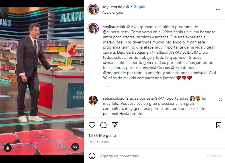 "Ayer grabamos el último programa de @supersupertv. Como verán en el vídeo había un clima hermoso entre productores, técnicos y artística. Fue una experiencia maravillosa. Nos divertimos mucho haciéndolo", expresó el conductor en su cuenta de Instagram.