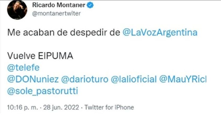 Horas más tarde, Montaner publicó en su cuenta de Twitter: "Me acaban de despedir de La Voz Argentina. Vuelve el Puma", expresó.