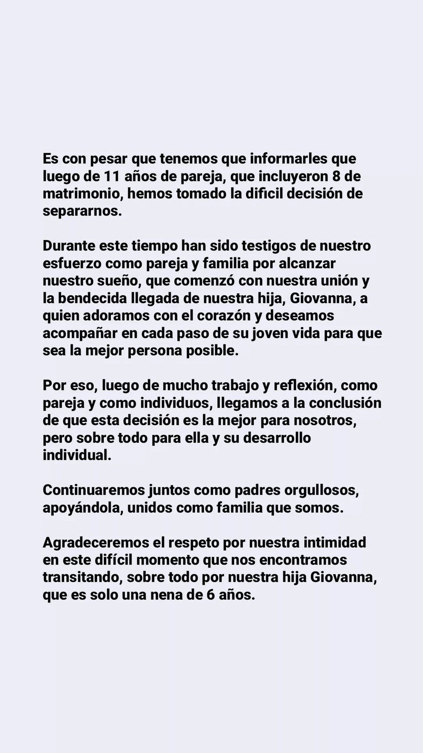 “Es con pesar que tenemos que informarles que luego de 11 años de pareja, que incluyeron 8 de matrimonio, hemos tomado la difícil decisión de separarnos. Durante este tiempo han sido testigos de nuestro esfuerzo como pareja y como familia por alcanzar nuestro sueño, que comenzó con nuestra unión y la bendecida llegada de nuestra hija, Giovanna, a quien adoramos con el corazón y deseamos acompañar en cada paso de su joven vida para que sea la mejor persona posible”, comenzó María Fernanda Callejón en una historia de Instagram.