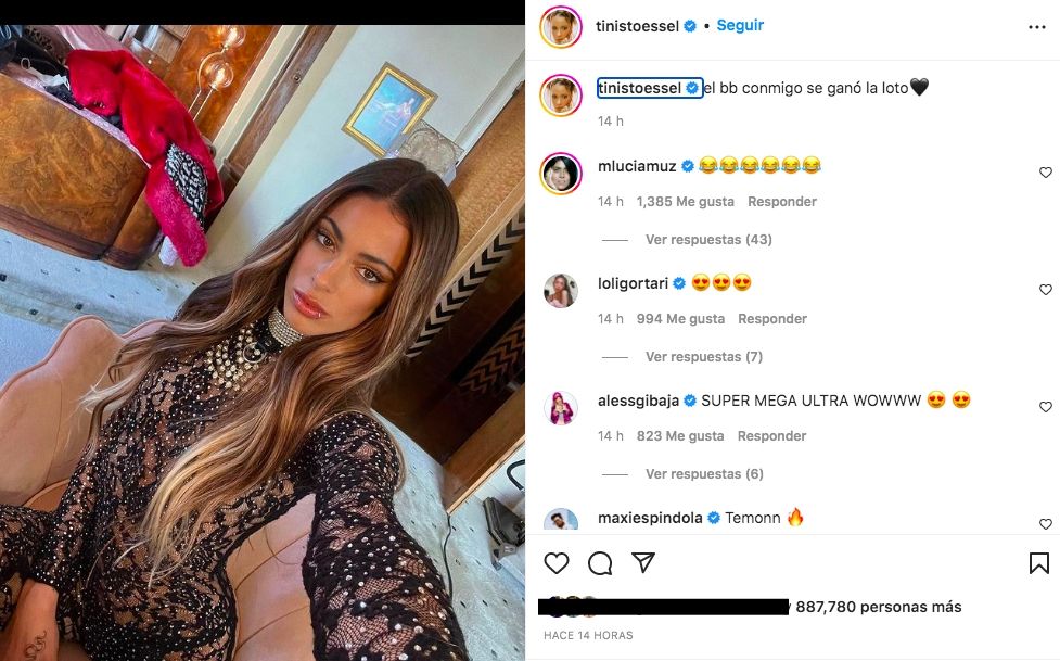Desde su cuenta de Instagram, Tini se mostró más que sensual con un enterito negro de encaje con transparencias en el que se limitó a dejar como mensaje "El bb conmigo se ganó la loto" junto a un corazón negro y su cuenta estalló en unas pocas horas. Muchos tomaron el posteo como una indirecta hacia Camila Homs, la modelo y madre de los hijos del futbolista.